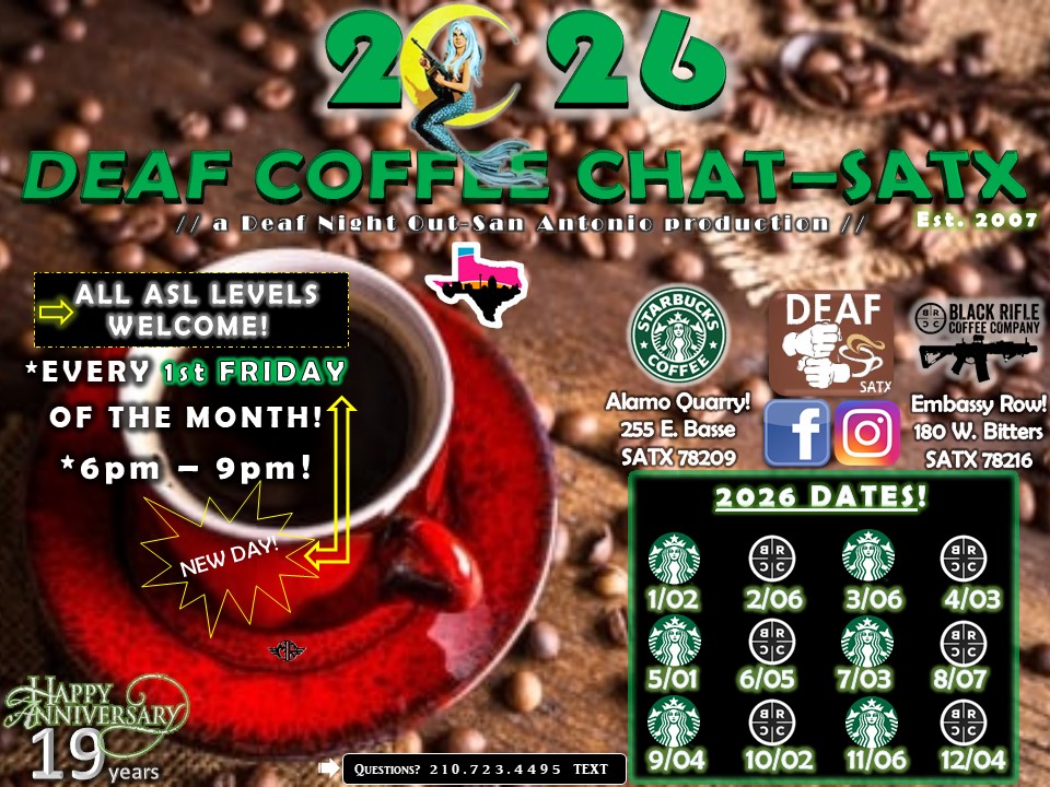 Experience the warmth and camaraderie of the Deaf Community over a cup of coffee at Starbucks at the Alamo Quarry. This gathering will take place on January 2nd 2026, from 6:00pm to 9:00pm, and provides the perfect opportunity to chat and connect with like-minded individuals. Don’t miss out on this chance to enjoy great conversation and delicious coffee in a welcoming and inclusive atmosphere. Join the deaf community for an unforgettable evening! All ASL Levels Welcome!